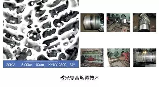 隨著激光熔覆技術(shù)的成熟與發(fā)展,陸續(xù)成功的應(yīng)用于瓦楞輥的激光熔覆見圖4,缸套火焰環(huán)的激光熔覆直接制造見圖5,發(fā)動(dòng)機(jī)部件修復(fù)見圖6等。實(shí)現(xiàn)了以激光為主要加工手段對各種金屬部件的幾何缺失,按照原制造標(biāo)準(zhǔn)進(jìn)行幾何尺寸的回復(fù)、性能的提升。隨著科學(xué)技術(shù)和工程技術(shù)的發(fā)展與需要,金屬部件工作的條件愈來愈苛刻,經(jīng)常工作在高交變應(yīng)力、高溫、高速、高腐蝕等極端條件下。因此,制造金屬部件的材料需要同時(shí)具有多種性能才能滿足零件特殊的服役條件。而且這些部件的制造成本、制造周期長,一旦失效產(chǎn)生巨大的經(jīng)濟(jì)損失和安全事故。如輪機(jī)裝備中,各類重要的部件如:葉片、轉(zhuǎn)子軸頸、閥桿、葉輪、閥門等;飛機(jī)發(fā)動(dòng)機(jī)、內(nèi)燃機(jī)部件等。這些工程上的技術(shù)難題,為激光熔覆技術(shù)提出了新的挑戰(zhàn)。因此,如何解決極端條件下失效零部件的修復(fù)問題是十分迫切和復(fù)雜的,需要對極端條件下,零部件的失效形式分析,剩余壽命進(jìn)行評(píng)估,選擇合適的材料、工藝方法。因此,以極端條件下關(guān)鍵零部件的強(qiáng)化與修復(fù)為切入點(diǎn),系統(tǒng)研究激光熔覆強(qiáng)化與再制造技術(shù),通過若干關(guān)鍵技術(shù)的聯(lián)合攻關(guān),獲得適合于極端條件下,各種零部件強(qiáng)化與修復(fù)的總體技術(shù)。