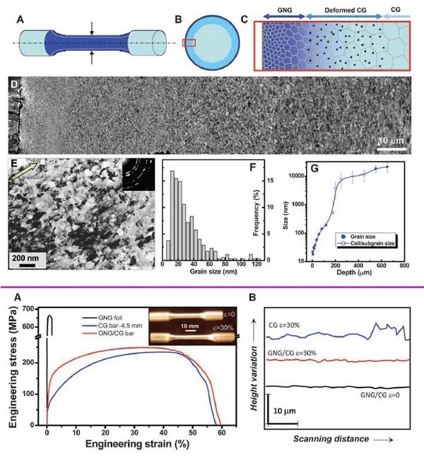 許多生物材料在局部化學(xué)組成或成分以及結(jié)構(gòu)特征上表現(xiàn)出空間梯度,這樣的空間梯度提高了生物材料的力學(xué)性能并賦予一定功能。為了優(yōu)化力學(xué)性能,梯度結(jié)構(gòu)被引入到金屬工程材料中。但在如何合成這種具有空間梯度的金屬材料,一直充滿著挑戰(zhàn)。從結(jié)構(gòu)的提出到實(shí)驗(yàn)室的成功合成,該過(guò)程經(jīng)歷了10年之久。第一個(gè)成功合成梯度結(jié)構(gòu)金屬材料的是我國(guó)沈陽(yáng)金屬研究所的盧柯院士,并將成果發(fā)表在了Science期刊上,繼而后來(lái)引發(fā)了全世界的科研浪潮。目前為止,合成梯度金屬材料的方法主要工藝主要為:a:表面機(jī)械摩擦處理(SMAT)是對(duì)板狀試樣進(jìn)行表面機(jī)械摩擦處理的一種方法;b:表面機(jī)械磨削處理(SMGT)用于處理圓柱形樣品;c:表面機(jī)械軋制處理(SMRT)用于處理圓柱形樣品;d:高壓扭轉(zhuǎn)變形,是目前應(yīng)用最多的方法之一。這些方法造成的梯度誘導(dǎo)了孿晶,位錯(cuò)以及層錯(cuò)能的梯度。微觀的結(jié)構(gòu)差異改變了宏觀的力學(xué)性能(主要是非均勻的變形行為引起)。納米晶區(qū)強(qiáng)度大,粗晶區(qū)延性好,二者的協(xié)同作用促進(jìn)了金屬材料的高強(qiáng)度和高延性。梯度晶體結(jié)構(gòu)是一種打破強(qiáng)塑性同時(shí)掣肘的很好地方法。TRIP和梯度結(jié)構(gòu)結(jié)合使得奧氏體鋼的塑性增加,但是強(qiáng)度維持不變。梯度結(jié)構(gòu)結(jié)合TWIP可以同時(shí)提高材料的強(qiáng)塑性。納米晶金屬塑性差的主要原因是缺乏加工硬化行為,從而導(dǎo)致早期應(yīng)變局部化和失效。梯度結(jié)構(gòu)可以抑制應(yīng)變局部化的早期發(fā)生。因?yàn)樘荻冉Y(jié)構(gòu)改變了變形機(jī)制,機(jī)械驅(qū)動(dòng)納米晶粒生長(zhǎng)。梯度結(jié)構(gòu)具有彈塑性均質(zhì)性和塑性非均質(zhì)性,從而形成宏觀應(yīng)變梯度。由于不兼容的變形,應(yīng)變梯度將單軸應(yīng)力轉(zhuǎn)變?yōu)槎噍S應(yīng)力。從粗粒度區(qū)域可以實(shí)現(xiàn)應(yīng)變?nèi)ゾ植炕蚝图庸び不?。因此,特殊的?yīng)力分布可能會(huì)增強(qiáng)位錯(cuò)的形核和擴(kuò)展,并導(dǎo)致額外的應(yīng)變硬化。梯度材料單軸變形柯分為三個(gè)階段:1)梯度晶體材料彈性變形;2)中心粗晶層開(kāi)始變形,但是納米表面層仍然彈性變形;這種不相容性使單軸應(yīng)力轉(zhuǎn)變?yōu)殡p軸應(yīng)力;同時(shí)存在兩個(gè)彈塑性界面,并隨外加應(yīng)變的增加而向表面移動(dòng)。出現(xiàn)應(yīng)力應(yīng)變梯度,形成協(xié)同強(qiáng)化和背應(yīng)力,提高屈服強(qiáng)度。3)粗晶層和納米晶層均可塑性變形,穩(wěn)定的頸縮首先發(fā)生在納米顆粒層中。然而,頸縮受到穩(wěn)定的粗粒度層的約束。頸縮層與中心穩(wěn)定層的界面附近出現(xiàn)陡峭的應(yīng)變梯度,通過(guò)必要的幾何位錯(cuò)和背應(yīng)力的積累促進(jìn)應(yīng)變硬化能力。此外,頸縮/穩(wěn)定界面從表面向中心層遷移,伴隨著高密度位錯(cuò)的積累,提高了應(yīng)變硬化速率,從而提高了梯度晶材料的延性。在梯度結(jié)構(gòu)中,粗晶層中的位錯(cuò)誘導(dǎo)硬化和納米層中的晶界遷移誘導(dǎo)軟化同時(shí)激活。巨大的應(yīng)變硬化能力主要來(lái)源于梯度層中由于不均勻變形產(chǎn)生的大量幾何必須位錯(cuò)。梯度組織的應(yīng)變硬化速率可與粗晶組織相當(dāng)。利用納米晶粒優(yōu)越的強(qiáng)度、粗大晶粒良好的塑性和梯度分布,實(shí)現(xiàn)了應(yīng)變?nèi)ゾ钟蚧皖~外應(yīng)變硬化,發(fā)展了強(qiáng)韌性材料。3.1 盧柯院士首次在《Science》雜志報(bào)道梯度銅該文是盧柯院士在國(guó)際上第一次合成梯度金屬材料并引起了國(guó)際間的極大關(guān)注與討論。該文一經(jīng)發(fā)表就引發(fā)了一股研究梯度材料的浪潮。通常納米金屬材料的強(qiáng)度很高,但是由于缺乏加工硬化行為,其塑性極差。該文通過(guò)表面塑性摩擦技術(shù)成功制備得了梯度銅,其顯微結(jié)構(gòu)為中心部位的粗晶層,越往表層晶粒越細(xì),在距離表面深度為150um范圍內(nèi)存在納米梯度層。拉伸性能測(cè)試顯示合成的梯度銅具有10倍于粗晶銅的強(qiáng)度,其塑性基本保持不變。研究發(fā)現(xiàn)機(jī)械力驅(qū)動(dòng)梯度層中晶粒的生長(zhǎng)是主要的變形機(jī)理。這種變形機(jī)理導(dǎo)致梯度銅在具有高強(qiáng)度的同時(shí)還能維持很好的塑性。
