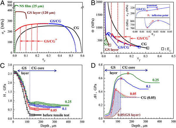 圖3 硬化速率上升以及額外的應(yīng)變硬化. A 工程應(yīng)力應(yīng)變曲線,應(yīng)變速率為5*10-4s-1.CG代表均勻的粗晶樣品;GS:代表梯度層,厚度約為120 μm:GS–CG:厚度為1mm的梯度-粗晶樣品。NS:納米金屬樣品. GS–CG+:在應(yīng)變分別為0.05, 0.1, 0.15, 和 0.2的加載-卸載樣品. B 應(yīng)變硬化速率-真應(yīng)變曲線;C維氏顯微硬度(H) vs深度曲線;(D)不同拉伸應(yīng)變后δ H (H增量)vs深度的曲線。