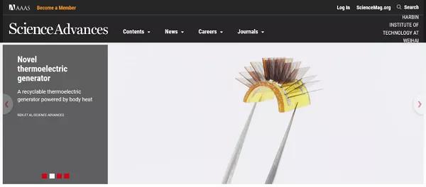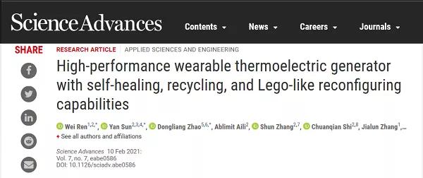有鑒于此,華中科技大學(xué)楊榮貴教授研究團(tuán)隊(duì)、美國(guó)科羅拉多大學(xué)肖建亮教授研究團(tuán)隊(duì)、哈爾濱工業(yè)大學(xué)張麗霞教授研究團(tuán)隊(duì)合作,在熱電器件研究領(lǐng)域取得重要突破。相關(guān)成果以“High-performance Wearable Thermoelectric Generator with Self-healing, Recycling and Lego-like Reconfiguring Capabilities”為題,于2月10日在線發(fā)表于Science Advances雜志上,被選為當(dāng)期的首頁(yè)滾動(dòng)推薦文章。哈爾濱工業(yè)大學(xué)的任偉博士和孫妍博士,以及東南大學(xué)的趙東亮教授為共同第一作者。