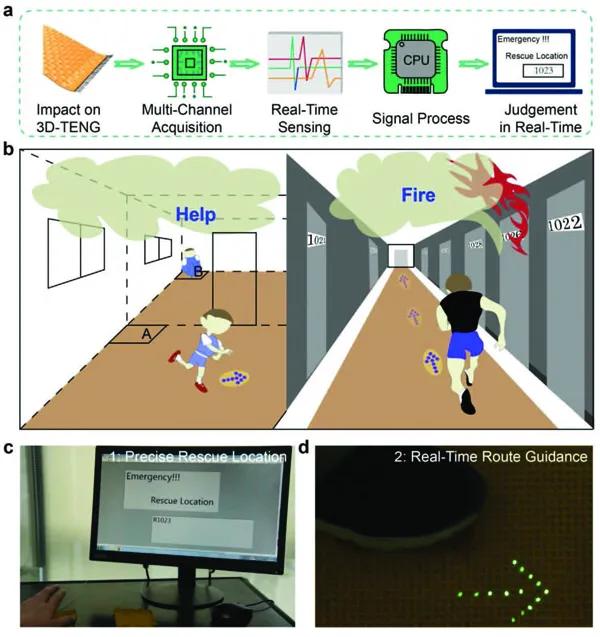 b)基于3D-F-TENG的智能地毯的示意圖,具有阻燃、精確救援定位、實(shí)時(shí)路線引導(dǎo)和降噪四大功能。