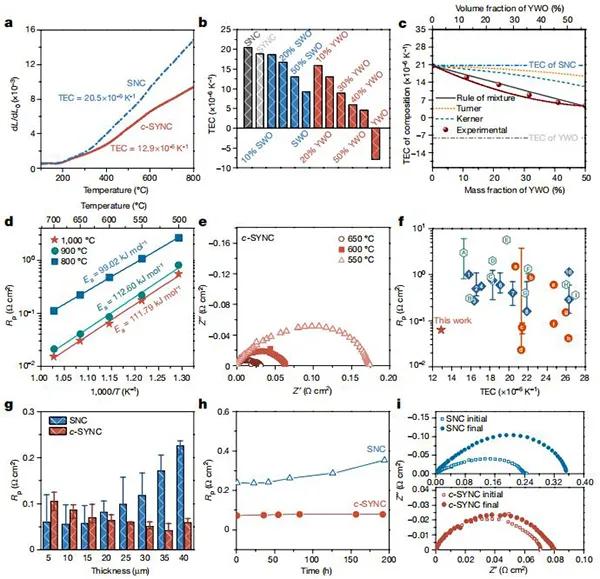 (a)c-SYNC和SNC在100至800℃的空氣中的熱膨脹曲線;(b)SNC,SYNC,x wt%SWO-SNC和x wt%YWO-SNC組成的TECs,質(zhì)量百分比x在0到100之間變化;(d)在800、900和1000℃燒制的c-SYNC電極的極化電阻;(e)在500、600和650℃下c-SYNC電極的阻抗譜;(f)在600℃條件下,各種ORE材料的RP與TEC的匯總圖;(g)基于c-SYNC和SNC的對(duì)稱電池的ASR值與電極厚度的函數(shù)關(guān)系;(h)40μm厚c-SYNC和SNC對(duì)稱電池在600℃的空氣中測(cè)量200小時(shí)的Rp;(i)耐久性試驗(yàn)前后c-SYNC和SNC電極的EIS圖。