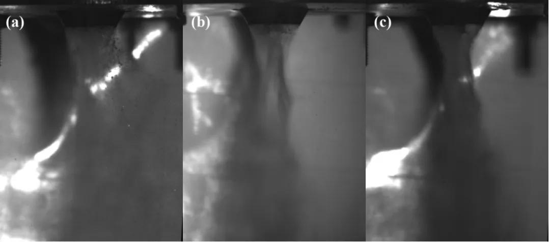 在霧化氣體壓力達(dá)到預(yù)定值并穩(wěn)定后, 形成的霧化流場(chǎng)也會(huì)變得穩(wěn)定, 液體破碎的機(jī)理和程度都不隨時(shí)間改變。如圖 5 所示, 為不同霧化氣體壓力下, 霧化流場(chǎng)穩(wěn)定后的圖像。圖 5 中的 (a)、(b)、 (c) 分別為霧化氣體壓力為 1.7MPa、 2.2MPa、2.7MPa 時(shí)的霧化流場(chǎng)圖像。