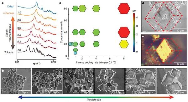 納米顆粒組裝已經被提出作為一種理想的方法來構建材料的層次組織,通過選擇納米尺度的組件來自下而上構建整個材料。多尺度結構控制是非??扇〉?,這是源于化學組成、納米尺度順序、微觀結構和宏觀形式都影響物理性質。然而,通常決定納米顆粒有序的化學相互作用,并不能提供任何在更大長度尺度上操縱結構的手段。微觀結構和宏觀形態(tài)仍然是未充分探索的設計參數,開發(fā)能夠將單個自組裝結構結合成宏觀的加工技術,將是開發(fā)在所有尺寸狀態(tài)下具有完全結構控制的納米顆粒的重要步驟。因此,基于納米顆粒的材料開發(fā)需要在不犧牲其自組裝納米級排列的情況下,定制微觀和宏觀結構的加工策略。其中,納米復合技術(NCT)非常適合生產此類分層材料,源于其固有的可伸縮成分組成,并使用動態(tài)結合相互作用來決定納米顆粒如何排列成有序陣列。每個NCT均由覆蓋有聚合物的無機納米顆粒組成,其中每個聚合物鏈均終止于超分子結合基團。將溶劑分散的NCT與互補結合基團混合后,超分子相互作用將顆粒組裝成更大的結構。由于將NCT連接在一起的超分子相互作用是動態(tài)的,因此通過其解離溫度冷卻一系列NCT,可使它們組織成有序的超晶格。然而,由于聚合物鏈在干燥過程中迅速收縮,之前試圖從組裝溶劑中去除晶格的嘗試導致了晶格的混亂。因此,從這些NCTs中形成獨立的宏觀固體,首先需要一些方法來穩(wěn)定它們,以防止在溶劑去除過程中的順序損失。今日,美國麻省理工學院 Robert J. Macfarlane教授課題組(通訊作者)提出通過逐漸引入與聚合物發(fā)生不利相互作用的非溶劑來穩(wěn)定晶格,以防止聚合物塌陷,與該非溶劑的相互作用將導致鏈采用較致密的構型并使晶格收縮。從而演示了快速組裝以克為單位的多面納米顆粒超晶格微晶的方法,利用此方法這些晶體可以類似于塊狀固體的燒結,進一步形成宏觀物體。該方法的關鍵是:控制納米顆粒組裝的化學相互作用在后續(xù)處理步驟中保持活性,這使得在形成宏觀材料時,可以保留顆粒的局部納米級有序性??梢愿鶕Ц裎⒕У某叽?,化學組成和晶體對稱性來調整固體的納米結構和微觀結構,微觀結構和宏觀結構可以通過后續(xù)的加工步驟進行控制。因此,這項工作提供了一種通用的方法,可以同時控制分子到宏觀長度尺度上的結構組織。相關研究成果以“Macroscopic materials assembled from nanoparticle superlattices”為題發(fā)表在Nature上。