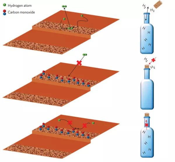 氫溢流是各種加氫反應(yīng)中常常存在的實驗現(xiàn)象,指的是原本無法解離H2的位點吸附了H,這個位點上的H就說從能夠解離H2的位點溢流過來的。Sykes教授利用這種現(xiàn)象設(shè)計了一個很有意思的實驗[7]。他們把Pd單原子負載在Cu表面。這時候Pd能夠解離H2,并且對CO具有很強的吸附能力;Cu表面無法解離H2,只能吸附解離后的H原子,并且對CO吸附能力弱。由于反應(yīng)的可逆性,H2也只能在Pd表面脫附而無法在Cu表面脫附。他們先通H2,H2在Pd單原子上解離,并溢流到Cu表面;再通CO,這時候CO會吸附在Pd單原子上,將其毒化。當升溫時,只有CO脫附之后,才會開始脫附H2。