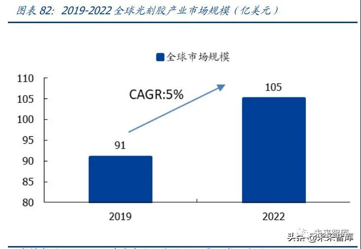 從光刻膠全球市場來看,根據(jù) Cision 的統(tǒng)計,2019 年約有 91 億美元的市場規(guī)模,且至 2022 年預(yù)計將達(dá)到 105 億美元,實現(xiàn)復(fù)合增長 5%。而其中半導(dǎo)體、LCD、PCB 這三類 主要的應(yīng)用場景分別占據(jù)了市場空間的24.10%、26.6%、及24.5%,分別對應(yīng)2019年 的市場規(guī)模 22 億美元、24 億美元、及 22 億美元。