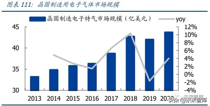根據(jù) SEMI 的數(shù)據(jù)統(tǒng)計,2019 年全球晶圓制造用電子氣體的市場規(guī)模在 42 億美元,而 全球晶圓出貨量面積在 2019 年為 11,810 百萬平方英尺。我們對其進(jìn)行簡單的匯率換算 (1 美元約等于 7人民幣),以及面積的換算之上,可得出每一片 8 英寸晶圓,所需電子 特氣的價值量約為 125 元人民幣。