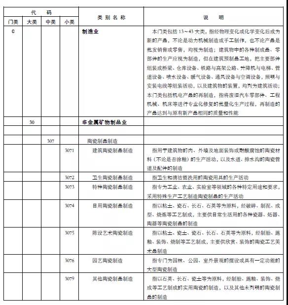 下表中節(jié)選了中國國標(biāo)分類表中的部分條目,例如大類30為非金屬礦物制品業(yè),其中類307為陶瓷制品制造,第四級(jí)小類分類3071到3079為陶瓷制品下屬的子類。從小類3071到3076分為為:建筑陶瓷制品制造,衛(wèi)生陶瓷制品制造;特種陶瓷制品制造;日用陶瓷制品制造;陳設(shè)藝術(shù)陶瓷制造。不容易歸類的統(tǒng)一劃到小類3079其他陶瓷制品。