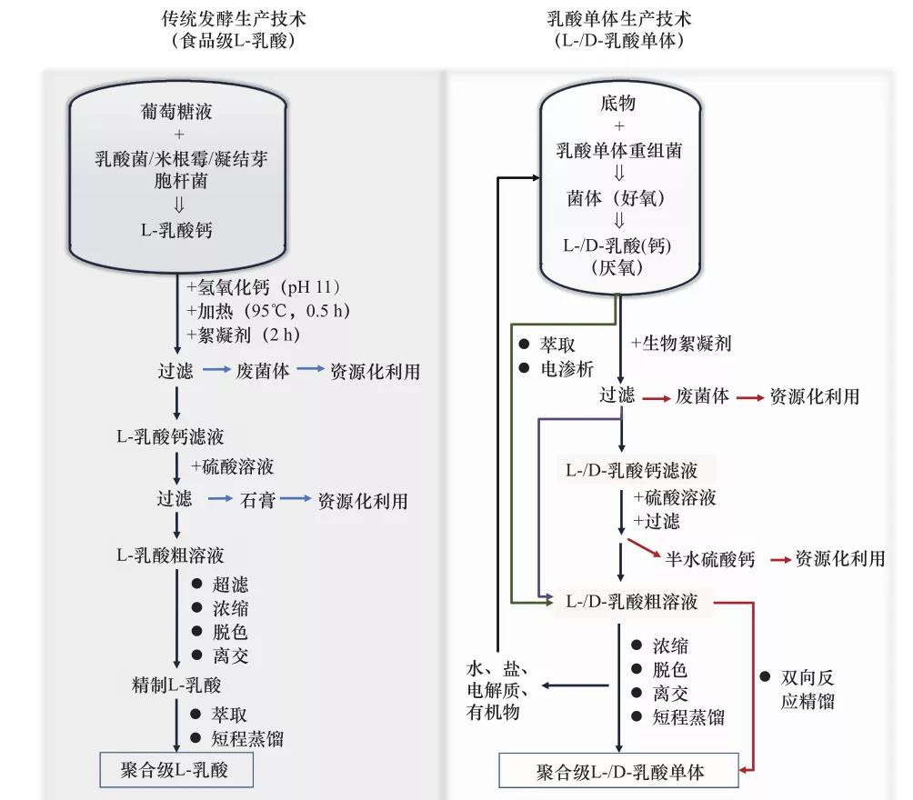 ②通過遺傳修飾技術(shù)強(qiáng)化乳酸單體合成的強(qiáng)度和水平,消除副產(chǎn)物生成途徑,拓展底物利用能力,由此最大程度地提高乳酸單體在發(fā)酵生產(chǎn)階段的光學(xué)純度、化學(xué)純度,簡化乳酸單體分離純化的工藝與裝備要求;