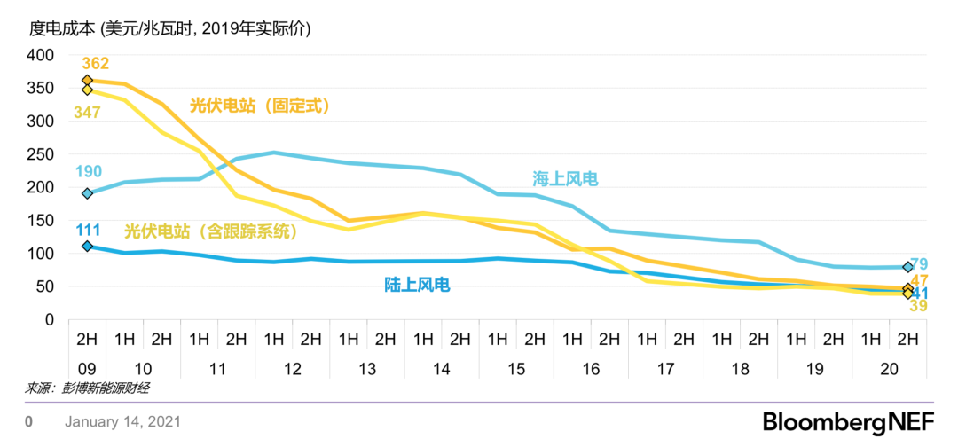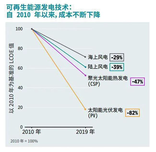 過(guò)去十年,光伏和風(fēng)電的度電成本分別下降了約八成和四成,且仍有進(jìn)一步下降空間。