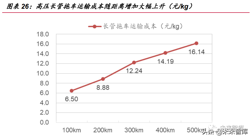 據(jù)中石油化工研究院數(shù)據(jù),當(dāng)運(yùn)輸距離為 50km 時(shí),氫氣的運(yùn)輸成本為 4.9 元/kg; 隨著運(yùn)輸距離的增加,長(zhǎng)管拖車運(yùn)輸成本逐漸上升,當(dāng)距離 500km 時(shí)運(yùn)輸成本近 22 元/kg,所以考慮到經(jīng)濟(jì)性問(wèn)題,長(zhǎng)管拖車運(yùn)氫一般適用于 200km 內(nèi)的短距離和運(yùn)量 較少的運(yùn)輸場(chǎng)景。此外可以看出,隨著距離增加,20MPa 和 50MPa 運(yùn)輸條件下的成 本逐漸分化,50MPa 下的成本優(yōu)勢(shì)越來(lái)越明顯,當(dāng)運(yùn)輸距離為 200km 時(shí),其成本差 距約 4 元/kg。實(shí)際上,超過(guò) 200km 的運(yùn)輸距離將導(dǎo)致拖車及人員配置冗雜的問(wèn)題。