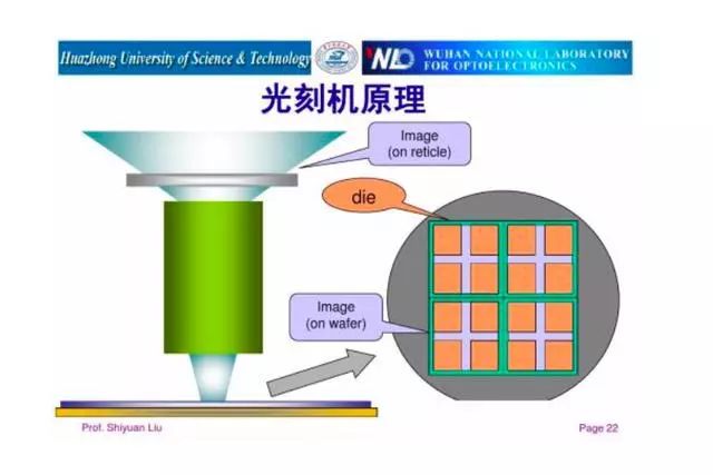 在光刻技術(shù)的原理下,人們制造了光刻機(jī),光刻機(jī)通過一系列的光源能量、形狀控制手段,將光束透射過畫著線路圖的掩模,經(jīng)物鏡補(bǔ)償各種光學(xué)誤差,將線路圖成比例縮小后映射到晶圓上,不同光刻機(jī)的成像比例不同,有5:1,也有4:1。然后使用化學(xué)方法顯影,得到刻在晶圓上的電路圖(即芯片)。
