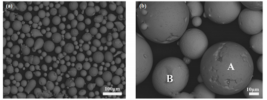 圖 1 粉末的微觀組織結(jié)構(gòu):(a) 低倍;(b) 高倍