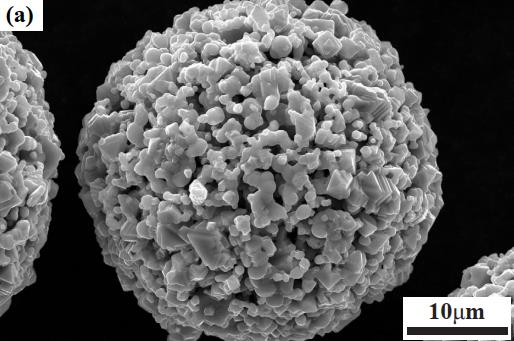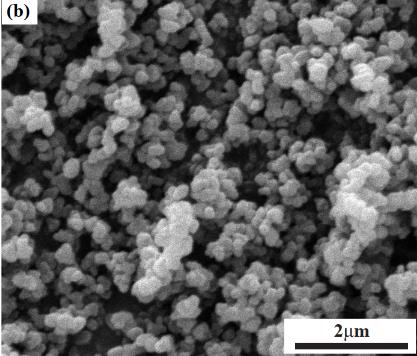 圖 3 Cr2O3-TiO2 復(fù)合粉末形貌特征:(a) 低倍;(b) 高倍