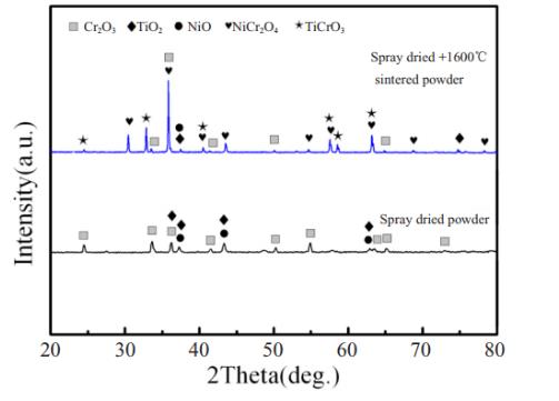 (1) 采用噴霧造粒和燒結(jié)工藝制備了適合大氣等離子噴涂工藝的 Cr2O3-TiO2 復(fù)合粉體。噴霧造粒粉體呈球形, 混合組元均勻彌散在球形顆粒內(nèi)。燒結(jié)后, 復(fù)合粉體內(nèi)部發(fā)生化學(xué)反應(yīng), 生成尖晶石結(jié)構(gòu)的 NiCr2O4 和鈣鈦礦結(jié)構(gòu)的 TiCrO3。