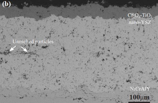摘要:本文以?Cr2O3、?TiO2?和?NiO?為原材料,通過噴霧造粒和燒結(jié)獲得了由尖晶石結(jié)構(gòu)?NiCr2O4?和鈣鈦礦結(jié)構(gòu)TiCrO3?組成的?Cr2O3-TiO2?復(fù)合粉末。采用大氣等離子噴涂技術(shù)在鎳基高溫合金表面制備?Cr2O3-TiO2/nano-YSZ?復(fù)合涂層,分析測試了復(fù)合涂層的微觀結(jié)構(gòu)、抗拉結(jié)合強(qiáng)度、抗燒蝕性能和高溫?zé)彷椛湫阅?。結(jié)果表明,?Cr2O