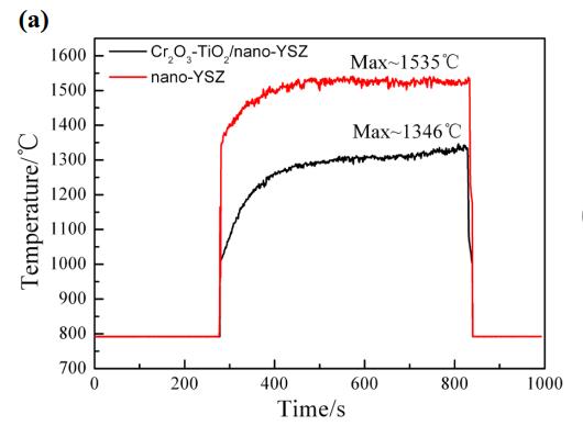 圖 9 Cr2O3-TiO2/nano-YSZ 復(fù)合涂層和納米 YSZ 涂層燒蝕過程中:(a) 表面溫度曲線;(b) 背部溫度曲線