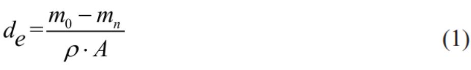 認(rèn)為試板的質(zhì)量減少是均勻減薄的結(jié)果。因此,引入基體當(dāng)量減厚參數(shù) (de), 其定義為基體質(zhì)量在規(guī)定面積內(nèi)減少的均勻厚度, 計算方法如公式(1) 所示: