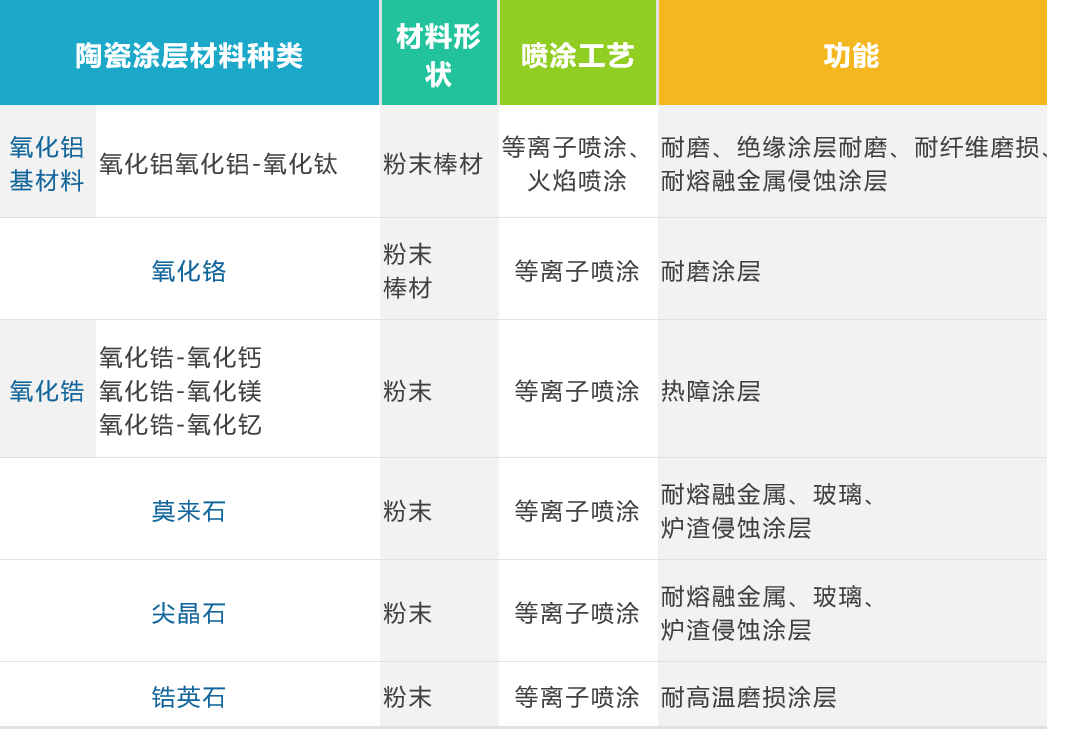 ▼常用陶瓷熱噴涂材料
